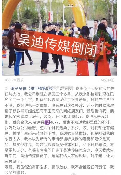 吴迪刚发快手说运营三个月的吴迪传媒倒闭,原因是和自己的合伙人霖哥发生矛盾,但是也承诺会承担相应的损失180多万,其实他准备去杭州发展的直播的时候就说过会卖掉吴迪传媒,估计那时候就有矛盾了,现在霖哥快手的评论已经炸了。