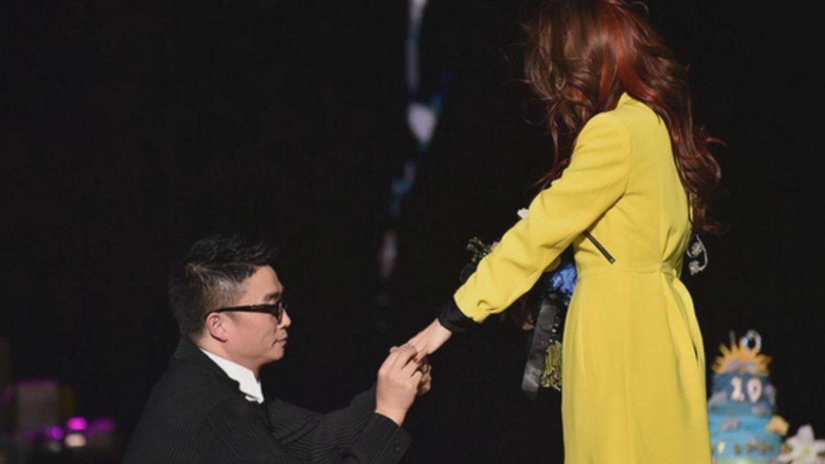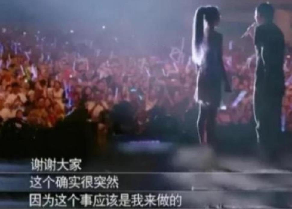 3个月后,在张靓颖巡回演唱会成都站尾声,冯轲单膝下跪求婚。