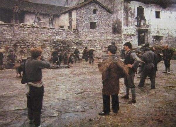工作队的詹、程二位队长被铡刀铡成三截。被匪徒们强迫来围观的村民们惶恐不已。