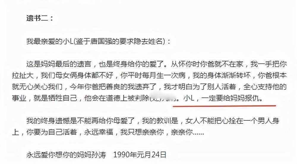 她留下了两封遗书,甚至还希望女儿唐莉替自己报仇。