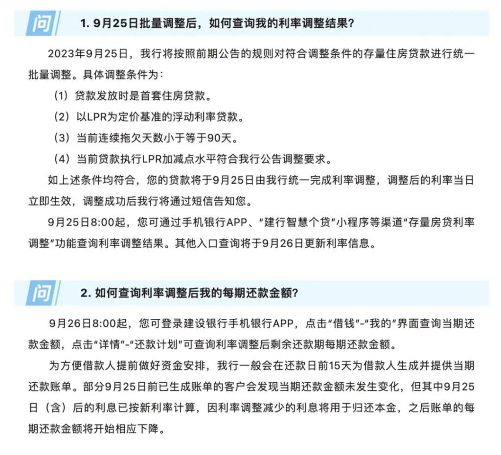 对于查询利率调整后客户的每期还款金额,建行称,9 月 26 日 8:00 起,客户可登录建设银行手机银行 APP,点击 " 借钱 "-" 我的 " 界面查询当期还款金额,点击 " 详情 "-" 还款计划 " 可查询利率调整后剩余还款期每期还款金额。