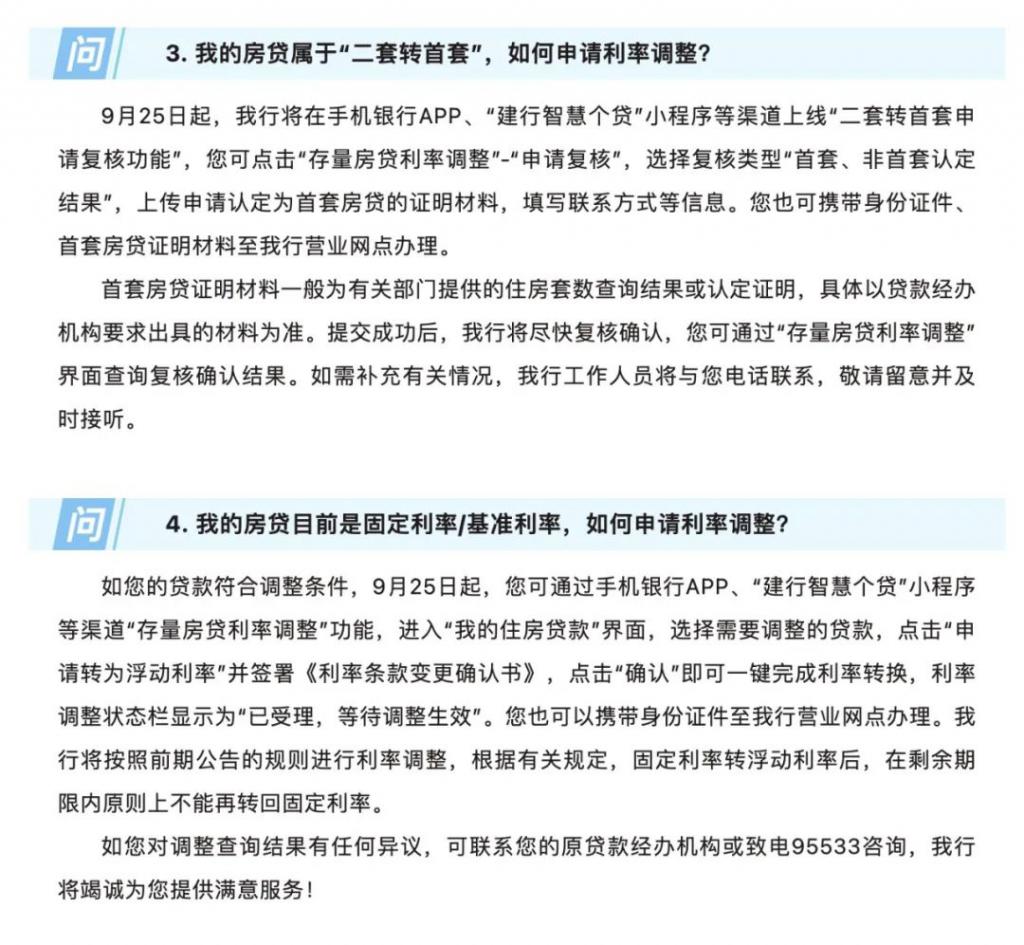 据建设银行 9 月 25 日发布的存量房贷利率批量调整问答,9 月 25 日 8:00 起,客户可通过手机银行 APP、" 建行智慧个贷 " 小程序等渠道 " 存量房贷利率调整 " 功能查询利率调整结果;其他入口查询将于 9 月 26 日更新利率信息。