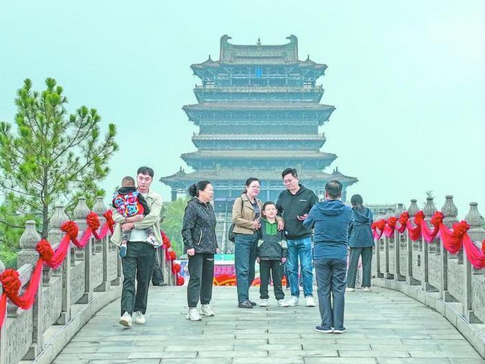 为了增加游客的互动体验感,鹳雀楼景区开展了拍照打卡和背诗赢礼品等活动,让人们在互动游戏中进一步了解名楼,感受名楼文化。