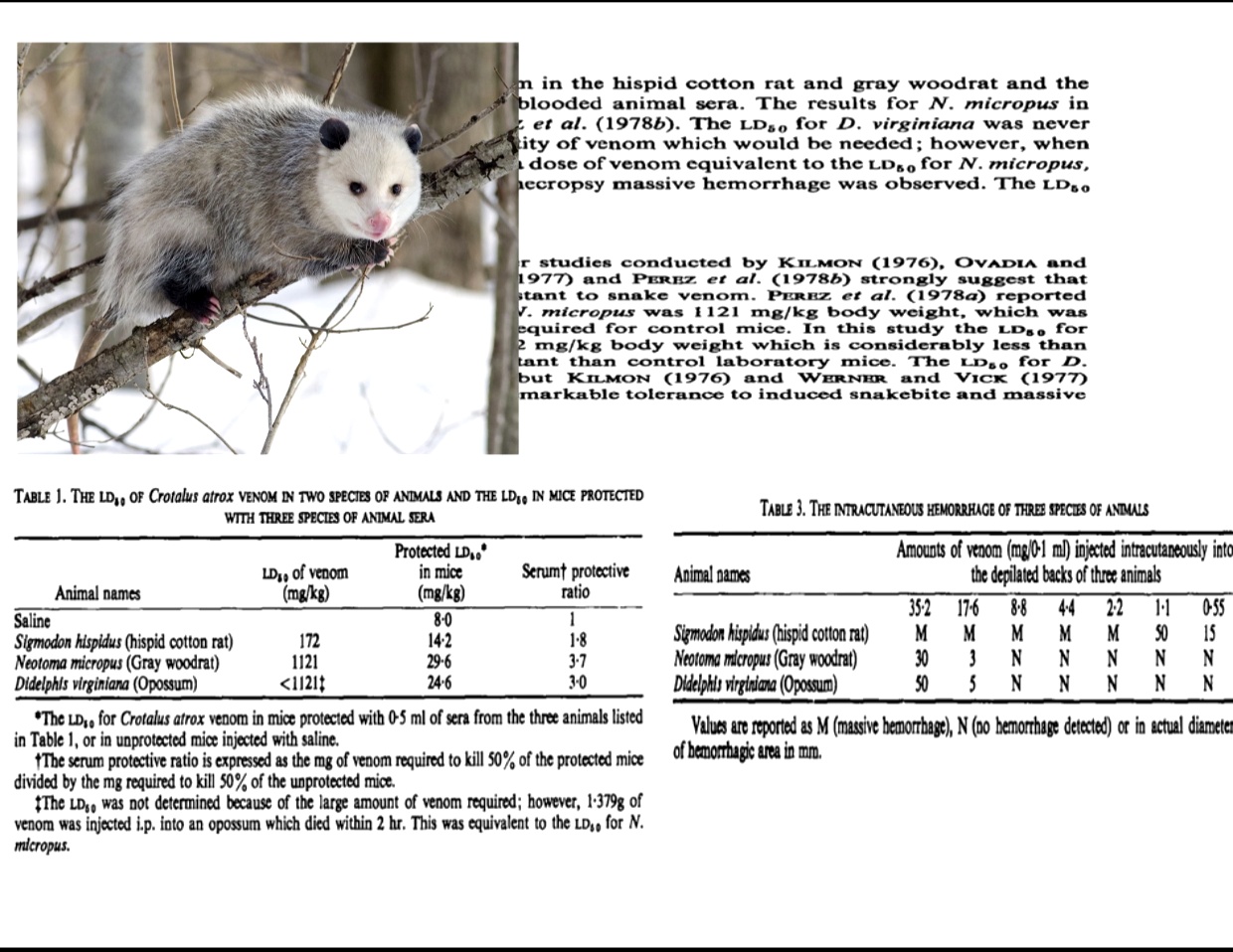 后来对弗吉尼亚负鼠腹腔注射高达1379mg西部菱斑响尾蛇毒液,才首次发现这玩意会被毒死,要知道弗吉尼亚负鼠也就和猫这么大。
