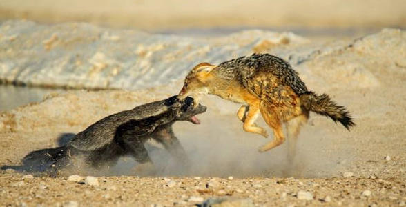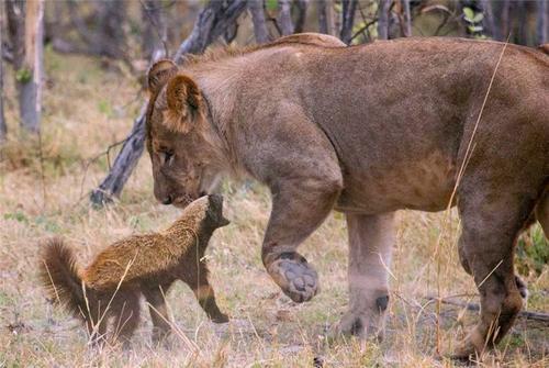 蜜獾招惹的动物,狮子猎豹是常客,鬣狗根本不放在眼里,这种完全不是一个“重量级”的比拼,蜜獾甚至还没对方的腿高。
