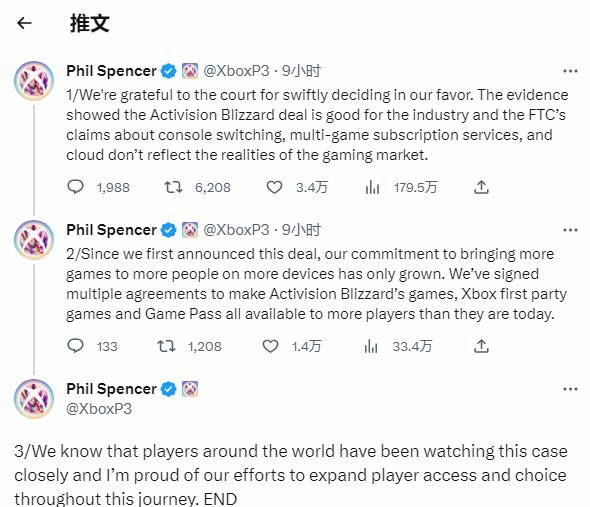 事后,Xbox 负责人菲尔 · 斯宾塞发文庆祝微软的这次胜诉: