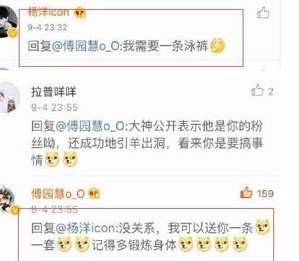 杨洋首先评论了李朱濠的微博,他发了一个偷笑的表情。傅园慧则和队友开玩笑:“你难道也想要我的美色”并配上了自己最喜爱的狗头的表情。李朱濠很快回以颜色:“你没有可以让我无理取闹的价值。”