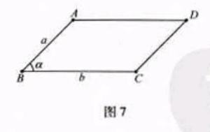 【例】一个边长分别为a和b的 长方形ABCD(图7),改变角B,使它成为一个内角为B=α的平行四边形ABCD,那么平行四边形ABCD的 面积是多少?