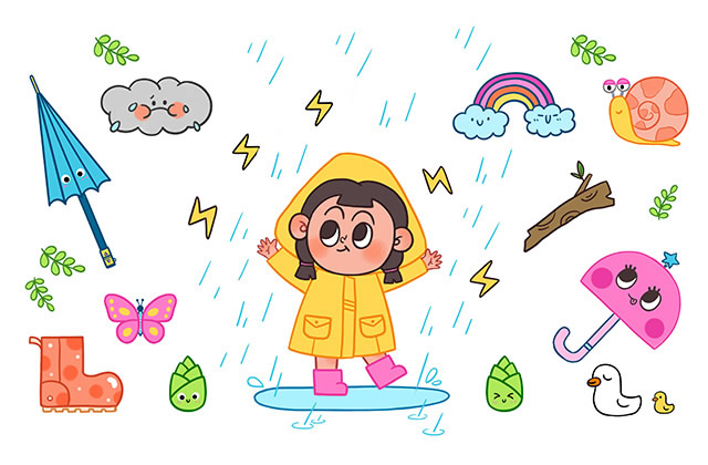 首先画一个小人,然后上像裙子一样的雨衣,头上也要戴上雨衣的帽子,再给小人画上雨靴。为了让画面更生动,可以在旁边用蓝色的彩笔画上雨滴,在地面画一个小水坑。周围可以画闪电、雨伞、乌云等卡通形状,让画面更丰富。