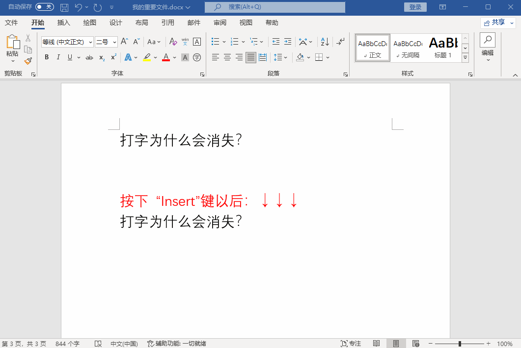 有时候我们在Word中打字,输入一段文本后,想要给中间添加内容,发现后面的字消失了。