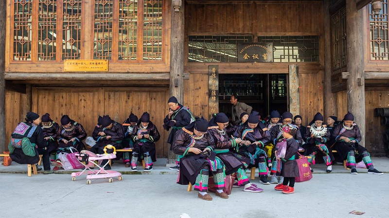 如果妇女盛装出行,会头挽髻,偏于左侧,髻旁饰有鲜花或银花 ,插银梳或木梳于髻旁,老人将一小块青布包住头部的下半部分,当包头帕使用,还会戴环状耳环,环下有三四颗亮珠。