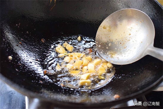 4、炒锅倒油,油热后下入大蒜碎炒香。