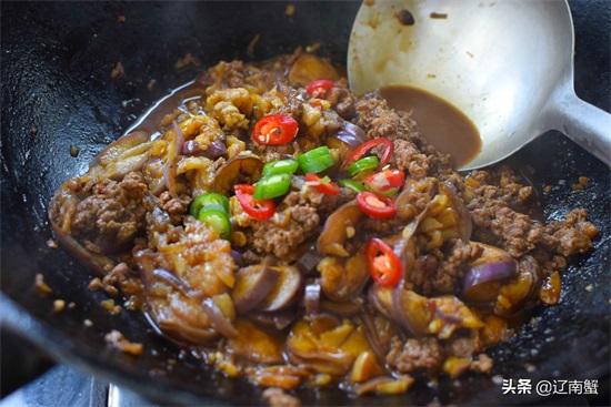 这道菜做好后会带一点儿汤汁,拌饭吃特别好。有肉来配茄子不需要很多油,炒出来也特别好吃。
