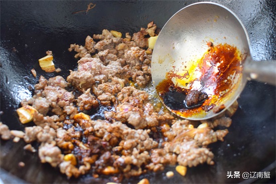 5、接着下入肉末炒香,炒肉末的时候加料酒和酱油调味,把肉末炒至酥香熟透。