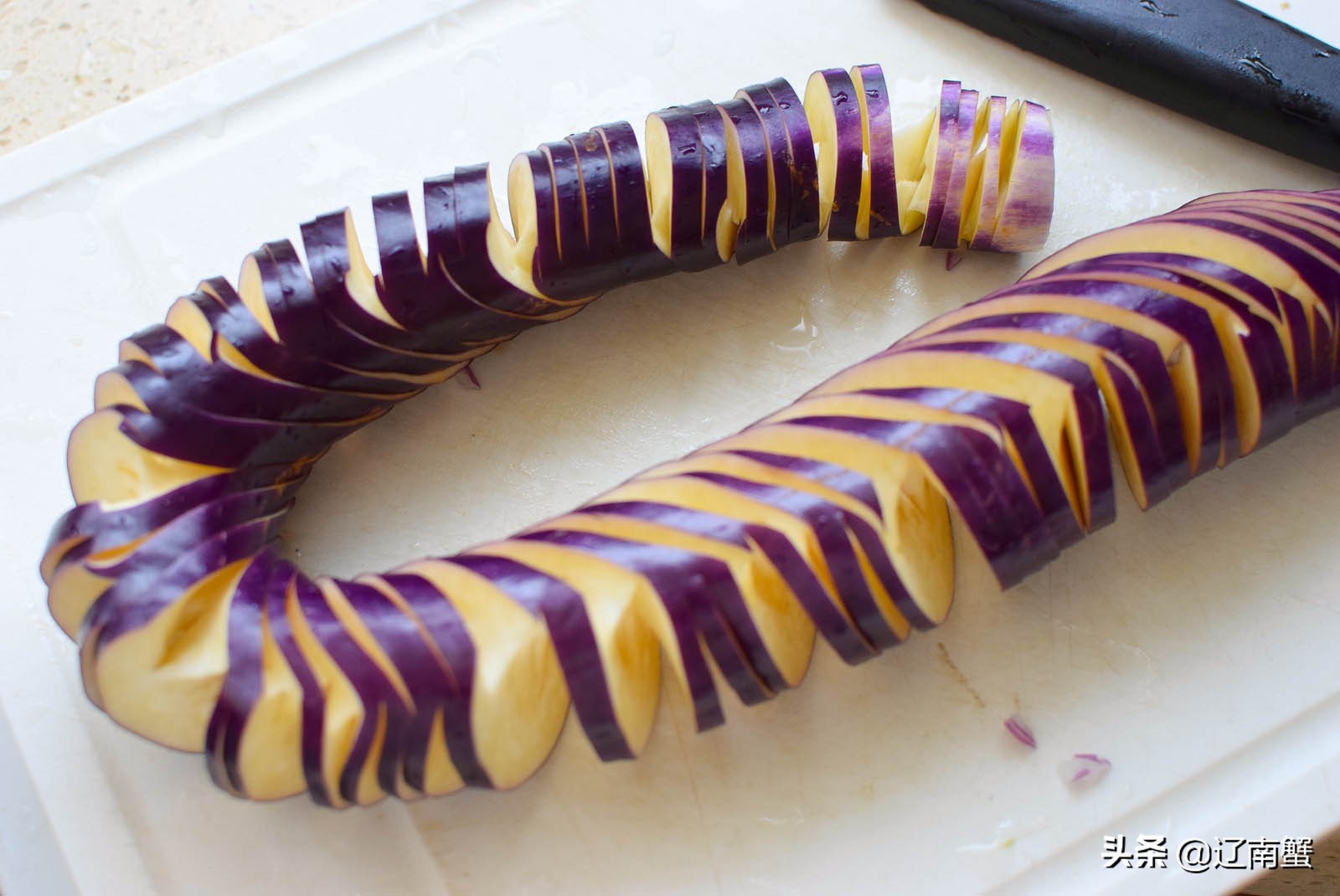 3、茄子切成蓑衣刀,可以在茄子两边各加一根筷子,比较好操作。蓑衣刀可以看前面的视频,切好的茄子就是这个样子。具体切方文章末尾有视频链接。