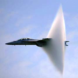 除此之外,由于在物体的速度快要接近音速时,周边的空气受到声波叠合而呈现非常高压的状态,因此一旦物体穿越音障后,周围压力将会陡降。在比较潮湿的天气,有时陡降的压力所造成的瞬间低温可能会让气温低于它的露点(Dew Point)温度,使得水汽凝结变成微小的水珠,肉眼看来就像是云雾般的状态。但由于这个低压带会随著空气离机身的距离增加而恢复到常压,因此整体看来形状像是一个以物体为中心轴、向四周均匀扩散的圆锥状云团。