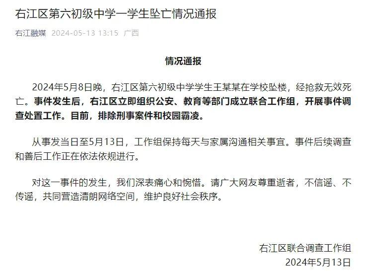 2024 年 5 月 8 日晚,右江区第六初级中学学生王某某在学校坠楼,经抢救无效死亡。事件发生后,右江区立即组织公安、教育等部门成立联合工作组,开展事件调查处置工作。目前,排除刑事案件和校园霸凌。