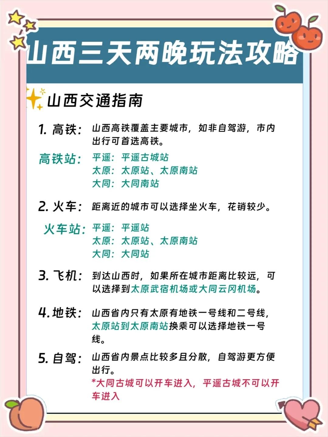 • 高铁覆盖主要城市,太原/平遥/大同都有站点