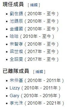 《Running Man》自2010年7月开播,元祖级成员原先还有宋仲基、Lizzy和Gary,3人分别在2010年及2016年宣布退出节目,梁世灿及全昭旻则是在Gary离开后的隔年加入,才组成如今的8人阵容。