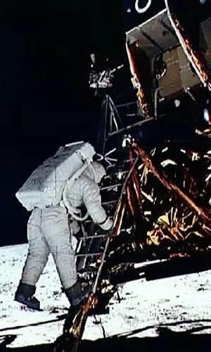 1969年7月20日,星期日,东部日光节约时间下午4点17 分42 秒,飞船在月球着陆。把仪器检查了三个小时之后,宇航员们穿上了价值三十万美元的太空衣,降低了登月舱内的压力。接着,阿姆斯特朗背朝外,开始从九级的梯子上下去。在第二级阶梯上他拉了一根绳子,打开了电视照相机的镜头,让五亿人看到他小心地下降到荒凉的月球表面。他的九号半B 的靴子接触到了月球表面,他说:“对一个人来说,这是小小的一步,但对人类来说,这是一个巨大的飞跃。”这时是下午10 点56 分20 秒。