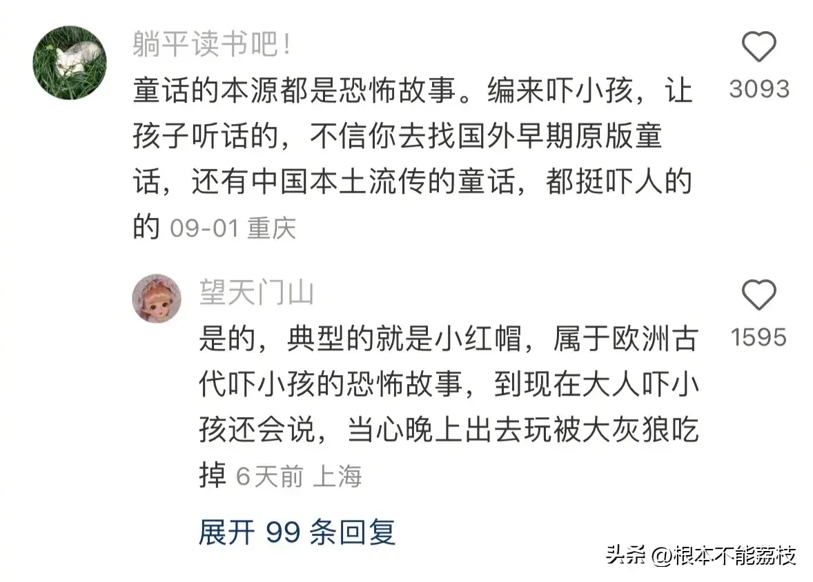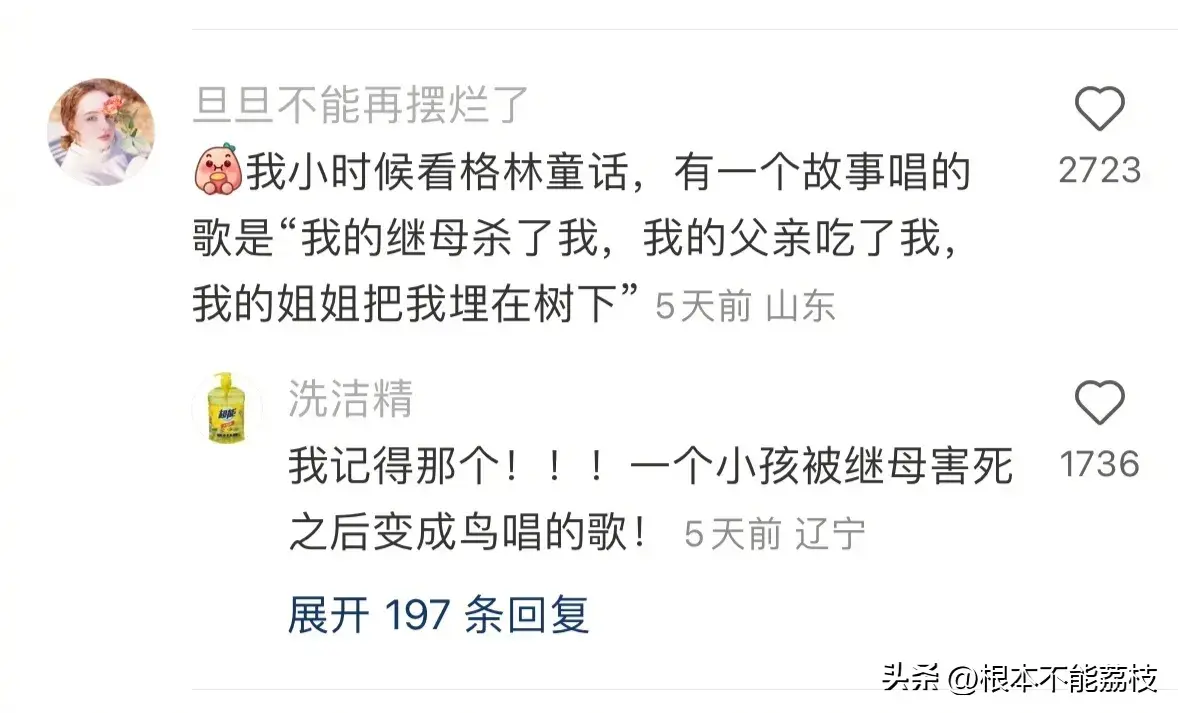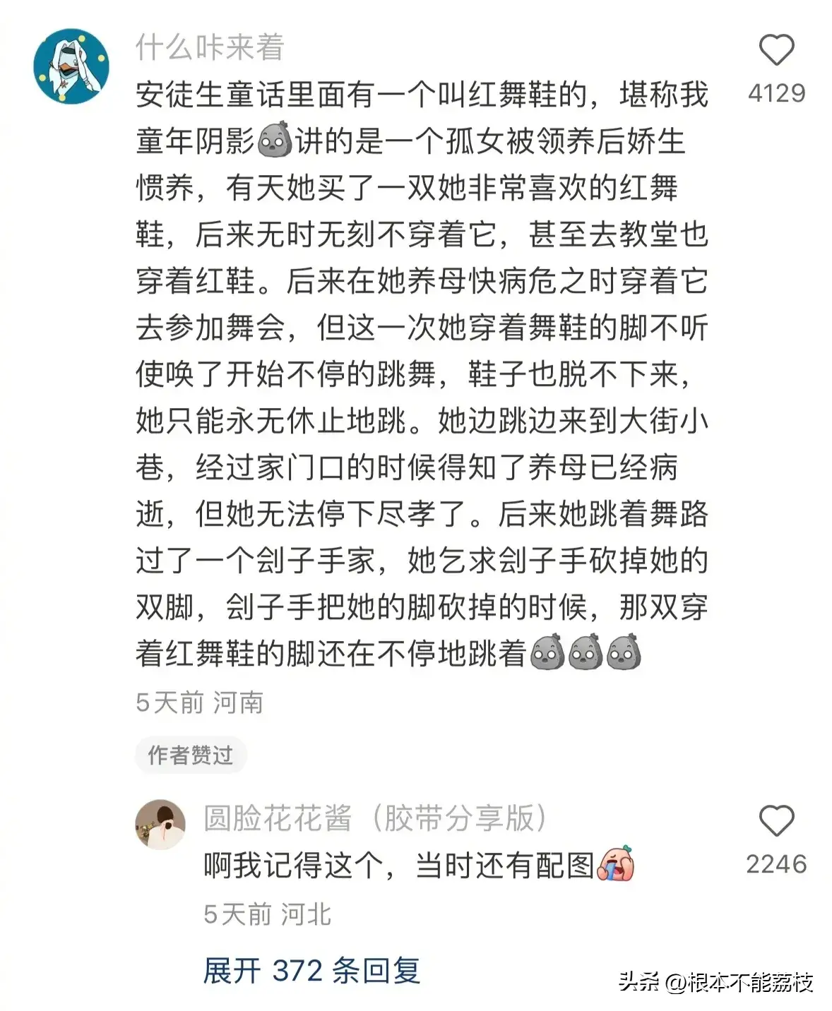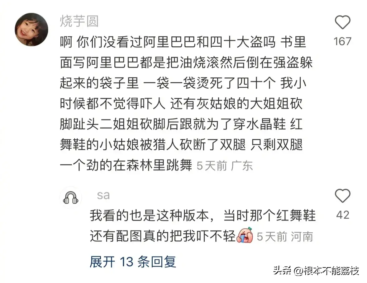 网友3: 童话故事里反派的下场都挺惊悚的,好像灰姑娘的继母是在婚礼上被要求穿着烧红的铁鞋跳舞,然后还有哪个公主故事的反派被装进钉满钉子的桶滚下了山坡,小时候只觉得结局大团圆,反派活该 但是这些手段真的很残忍。