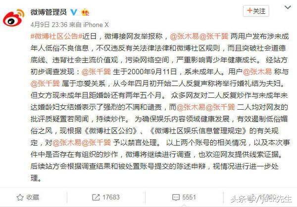 尽管一大波不明真相的水军祝福,但是微博管理员通过微博发声明,称经网友举报,张木易、张千巽两用户发布涉未成年人低俗不良信息,不仅违反有关法律法律和微博社区规则,而且突破社会道德底线、违背社会主流价值观,污染网络空间,严重影响青少年健康成长,对两人予以禁言处理。