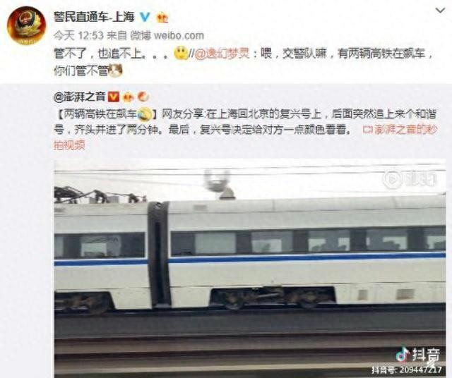 网友:歪,喂,交警队吗,有两辆高铁在飙车!还管不管了? @警民直通车-上海 表示:管不了,也追不上。