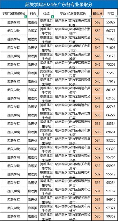 韶关学院2024年广东各专业录取分及位次(提前批卫生专项)