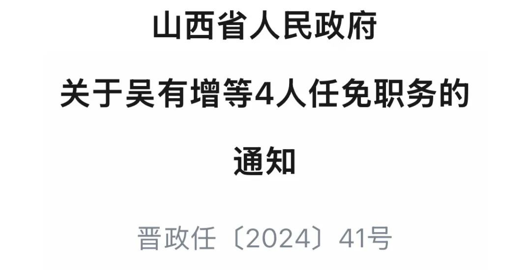 决定任命:吴有增为山西焦煤集团有限责任公司专职外部董事,刘敬为万家寨水务控股、山西航产集团有限公司专职外部董事,乔建峰为省文化旅游投资、山西交通控股集团有限公司专职外部董事;决定免去:刘敬的晋能控股集团有限公司副董事长、董事职务,乔建峰的山西建设投资集团有限公司副董事长、董事职务。