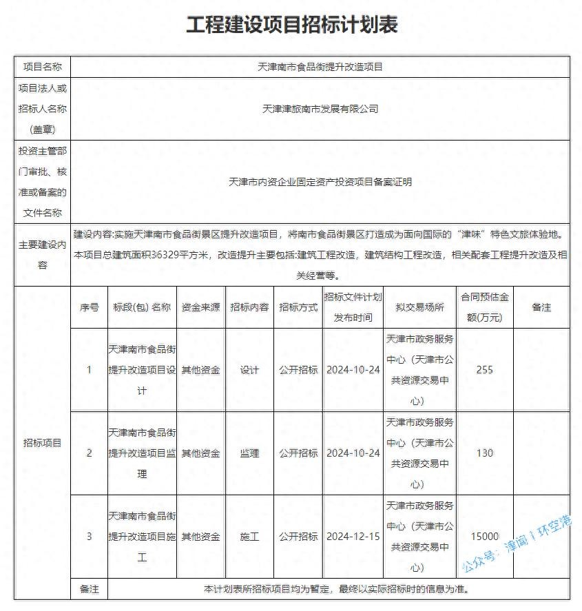 近日消息,天津市公共资源交易网发布关于《天津南市食品街提升改造项目》招标计划表,建设内容抢先看。