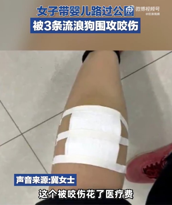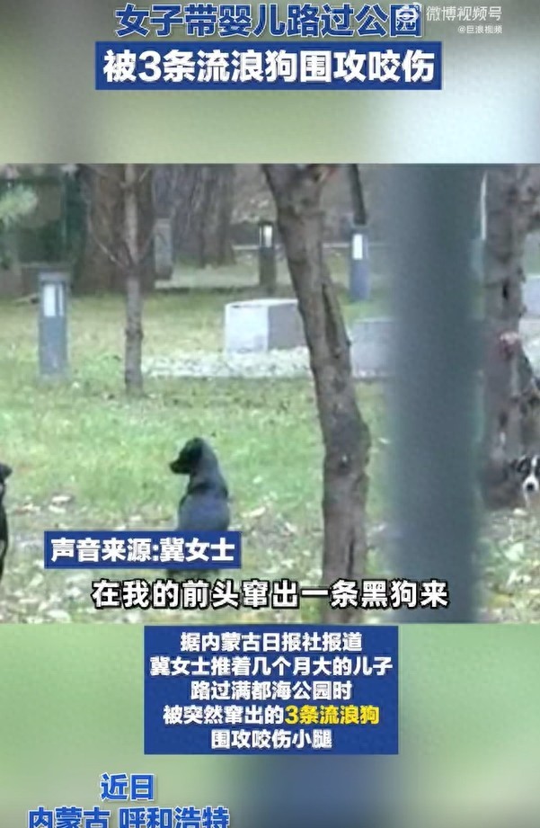 近日,内蒙古呼和浩特。一女子推着几个月大的儿子路过满都海公园时,被突然窜出的3条流浪狗围攻咬伤小腿。