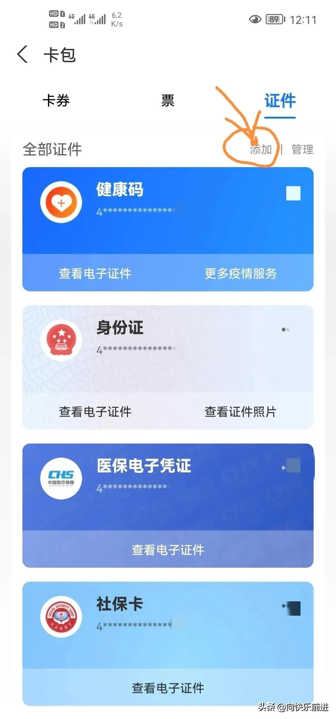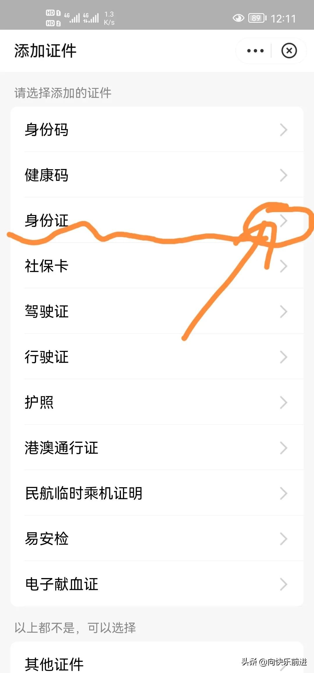 4.进入添加选项后会发现有很多种证件明细,如有需要,也可以添加其他证件,特别是驾驶证,行车证,都是很实用的,已经实测过交警查验有效。这里我们选择“身份证”继续。