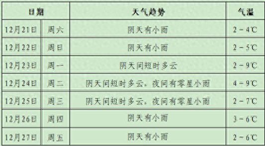 预计未来一周(12月21日至27日)我市中期(23~25日)气温略有回升,其余时段以低温阴雨天气为主。
