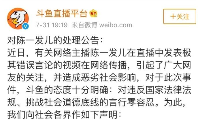 一直一来对于抗日战争我们都应该严肃对待,但是陈一发却是当做儿戏,对社会造成了负面影响。对此,其直播平台斗鱼也是第一时间做出了回应,将会封闭陈一发的直播间。