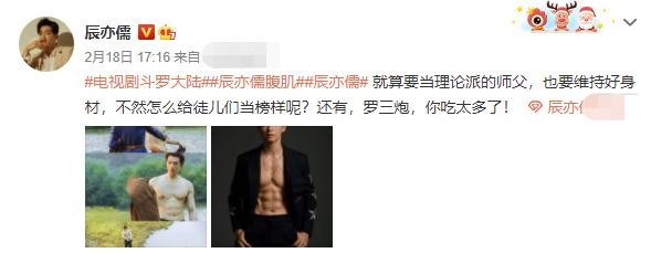 近日,辰亦儒参演的电视剧正在热播中。2月18日,辰亦儒在社交平台上晒出一组腹肌剧照,并称:“就算要当理论派的师父,也要维持好身材,不然怎么给徒儿们当榜样呢?还有,罗三炮,你吃太多了!”