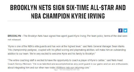 NBA吐槽大会【官方:篮网签下欧文】北京时间7月7日,篮网官方宣布,他们已经签下了自由球员凯里-欧文。“凯里是NBA顶级后卫之一,他在最高水准的比赛里获得过胜利,他的冠军血统,加上他很有天赋的得分和组织能力,这会让他成为我们球队一个很好的补充,我们非常激动地欢迎凯里和他的家人来到布鲁克林。”篮网总经理肖恩-马克斯说道。