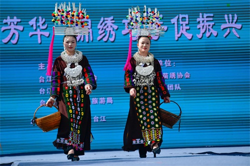 4月13日,表演者在贵州省台江县参加姊妹节“T台”服饰秀。新华社发(欧阳光林摄)