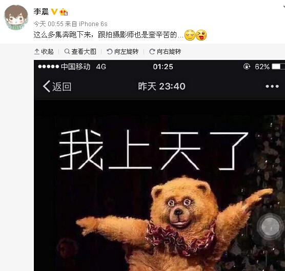 今日凌晨李晨发微博“这么多集奔跑下来,跟拍摄影师也是蛮辛苦的…”配图却是“我要上天了”。原来是录制《奔跑吧兄弟》第四季,李晨居然又是第一个被out,还称:好久没有这么休息了,请允许我炫耀一下。