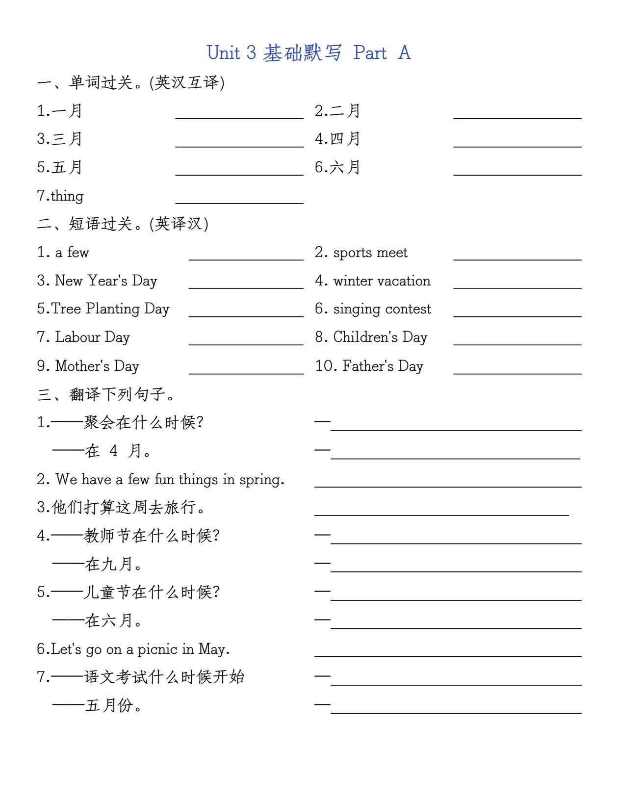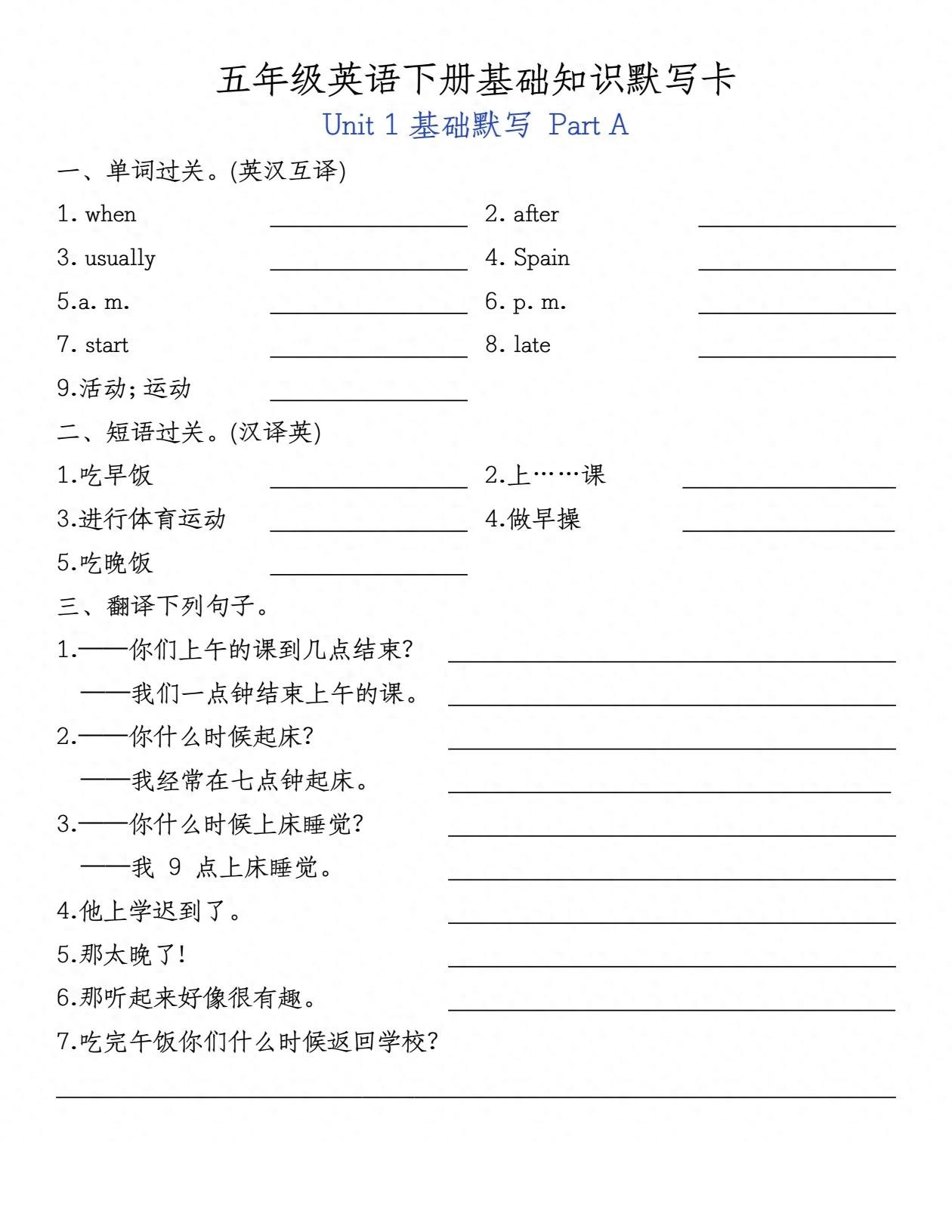 五年级下册英语基础知识默写卡