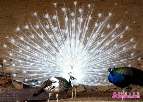 近日,济南跑马岭景区上演白孔雀开屏的惊艳一幕,由于十分罕见,引得围观游客纷纷惊呼。据了解,国际上公认的孔雀品种只有蓝孔雀和绿孔雀,白孔雀一般指人工繁育下野生蓝孔雀的变异品种,数量稀少,是极为珍贵的观赏鸟。(中国山东网记者焦竞赛 通讯员钟福生 摄影报道)