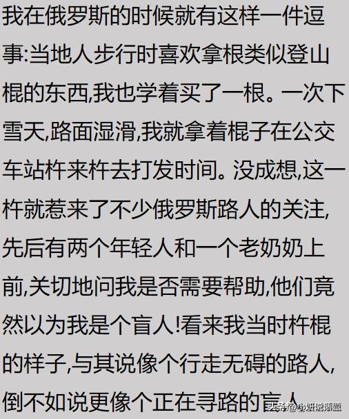 “在俄拿棍打发时间,被误认盲人,路人纷纷关切询问是否需要帮助。”