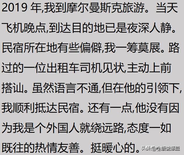 “2019 年在摩尔曼斯克旅游,飞机晚点,幸得热心司机相助顺利到民宿。”