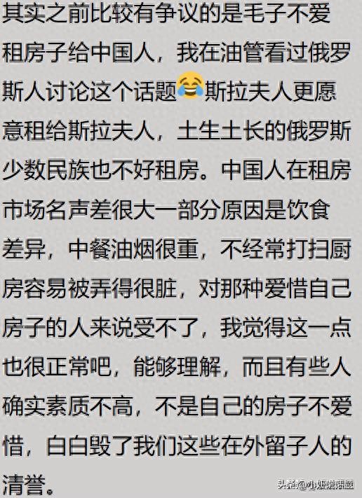 “俄租房市场,斯拉夫人优先,中国人因饮食差异等名声差,能理解但需改善。”