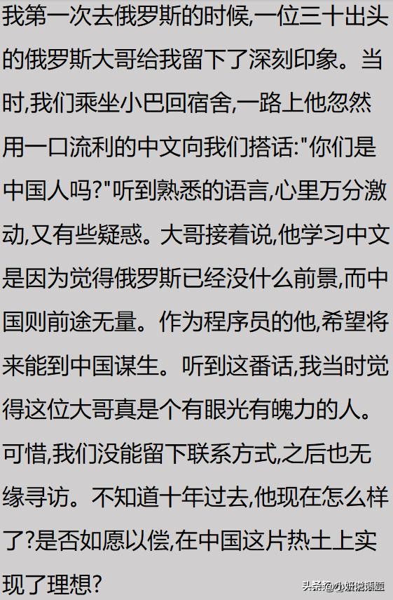 “认识汉语东北腔俄老哥,曾有中国女友,对我学术论文感兴趣且很体贴。”