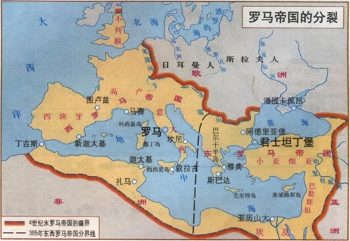 狄奥多西在临终前,将罗马划分为东西罗马,分给了他的两个儿子继承。以亚得里亚海为界,罗马帝国分裂为东、西罗马帝国。东罗马帝国以君士坦丁堡为首都,西罗马帝国以罗马为首都。而基督教也随着罗马帝国的分裂而形成了两大教派。一派是东罗马帝国的东正教会,一派是西罗马帝国的天主教会。这标志着,基督教的两大教派东正教和天主教的形成。