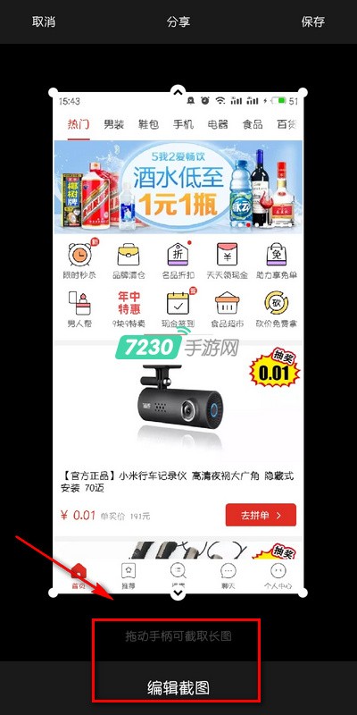 3、显示出截图之后就可以编辑了,可以把图片往下拉伸,直到自己截到自己满意的长图,保存即可