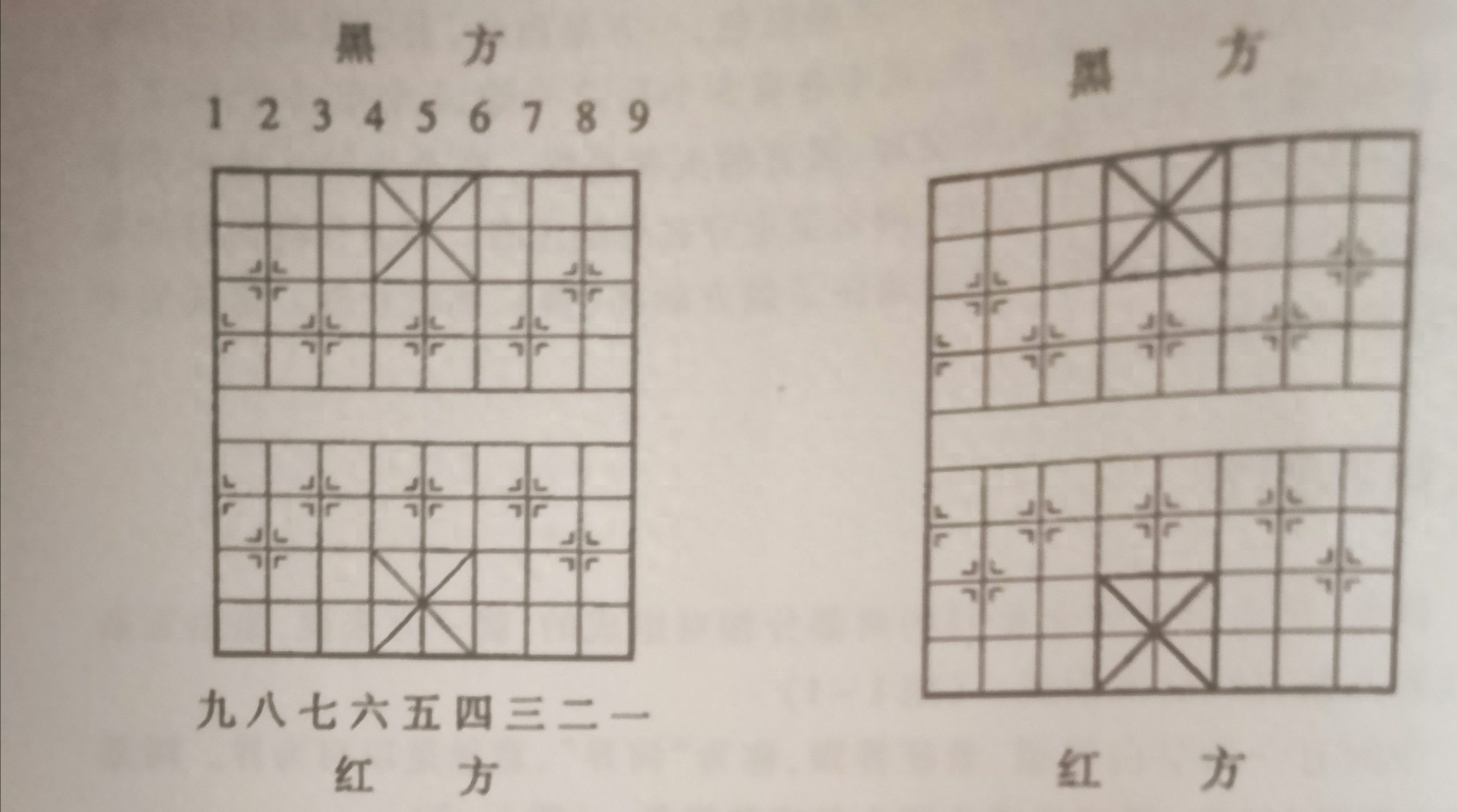 棋盘,是一个轴对称图形,那一面来说,是由五条横线和九条直线交叉而成。中间有条楚河汉界,被称为河间,目的是以河为界,两边分别与河界相连,便成了横十竖九的完整棋盘。河界中间不表直线圈,棋子跨越河界,无论直走斜走,均按照有线行棋,每方直线的标法,从左到右,依次为1—9路,我放9路即是对方一路,依次类推。(注意己方线路只代表己方棋子的位置,各记各路,以免混淆。)双方棋盘有个米字行图案,称为九宫。这是帅(将)和士卫的活动范围。