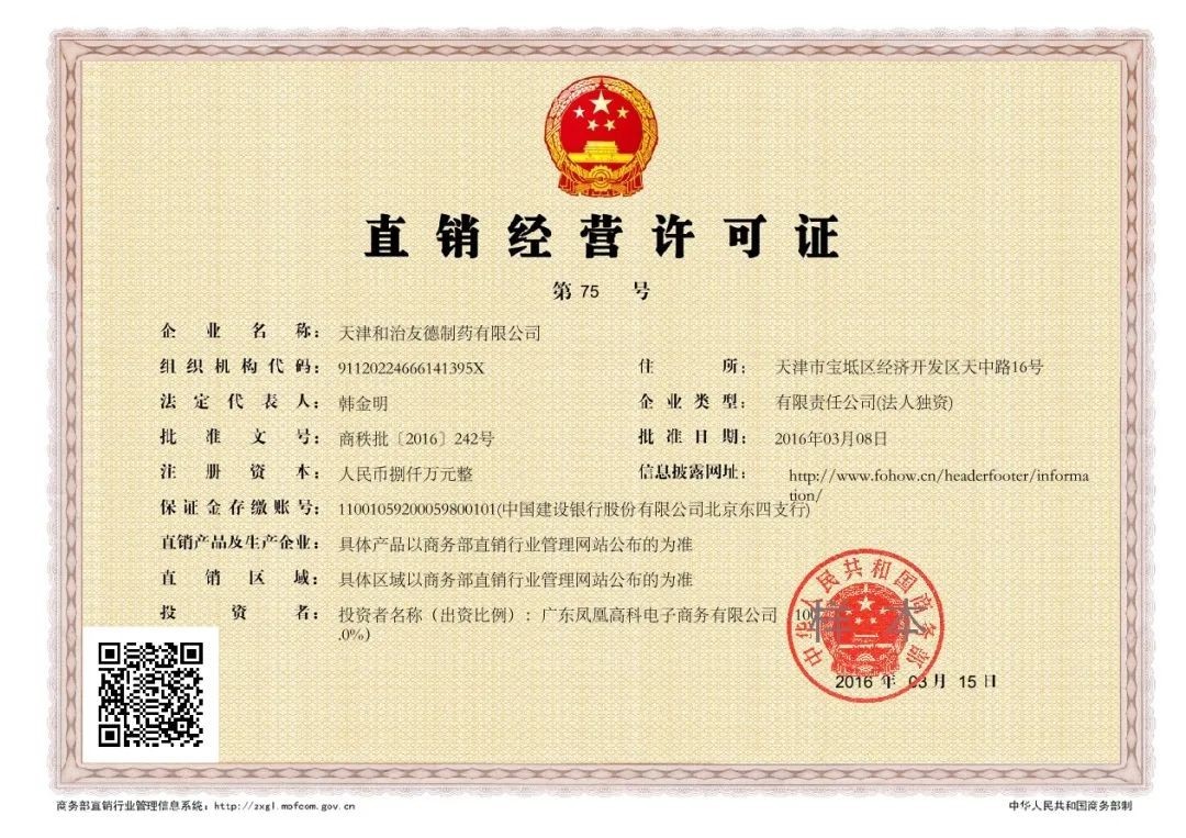 商务部批牌 2016年5月,和治友德正式得到商务部通知,企业信息已在商务部直销行业管理信息系统进行公示,获得第75块直销经营许可证。这标志着一家在海外运营九年的跨国直销企业终于回到祖国怀抱。