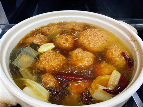 另起一锅,锅底加少许油,放入葱姜蒜和大料煸香,然后再加适量清水,加3勺生抽和1/4勺老抽,再加1块黄冰糖、3个干辣椒、2片香叶和1块桂皮。烧开后放入炸好的肉丸子,盖上盖子中小火闷煮30分钟。30分钟后狮子头出锅,汤汁勾芡一下,淋在狮子头上即可。