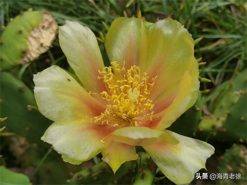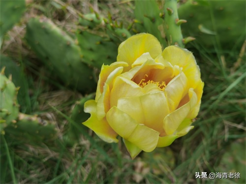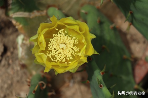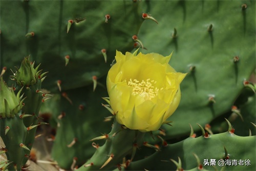 先看一种最常见的仙人掌吧,它又叫仙巴掌、火焰、火掌、霸王树等,它开的花是金黄色的,花姿优美,花型和荷花有些相似,花瓣色泽嫩黄,半透明状,一片片相互簇拥着,中间是细细的黄丝花蕊和黄白色的柱头,伸展着十分娇艳别致。